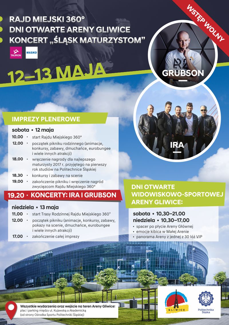W weekend, 12 i 13 maja, przy Arenie Gliwice czekają nas dni otwarte hali, Rajd Miejski 360°, piknik rodzinny oraz wieczorne koncerty zespołów IRA i Grubson w ramach imprezy „Śląsk Maturzystom”.