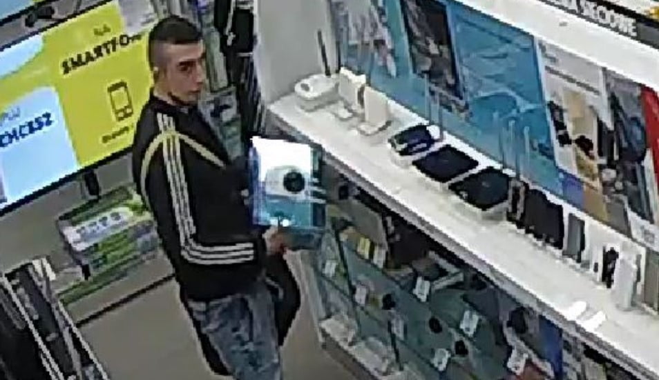 Widoczny na zdjęciach mężczyzna podejrzany jest o kradzież sprzętu komputerowego o wartości 1187 zł z jednego ze sklepów w centrum handlowym Forum.