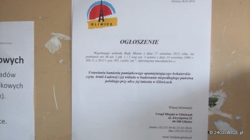 Wypełniając uchwałę Rady Miasta z 17 września 2012 roku (…) informujemy mieszkańców o: Ustawieniu kamienia pamiątkowego upamiętniającego bohaterskie czyny Armii Ludowej i jej wkładu w budowanie niepodległego państwa polskiego przy ulicy jej imienia w Gliwicach”.