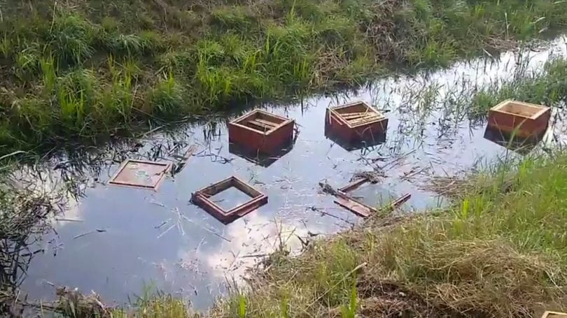 Pięć domków dla pszczół stało na drewnianych belkach – te zostały celowo wywrócone. Kilka wpadło do wody, co powoduje, że są nie do odratowania.