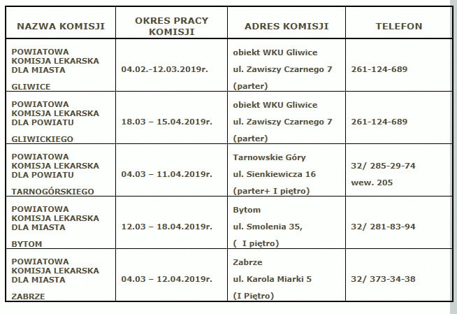 Na obszarze administrowanym przez WKU Gliwice zostało powołanych pięć powiatowych komisji lekarskich w ramach kwalifikacji wojskowej w 2019 roku: