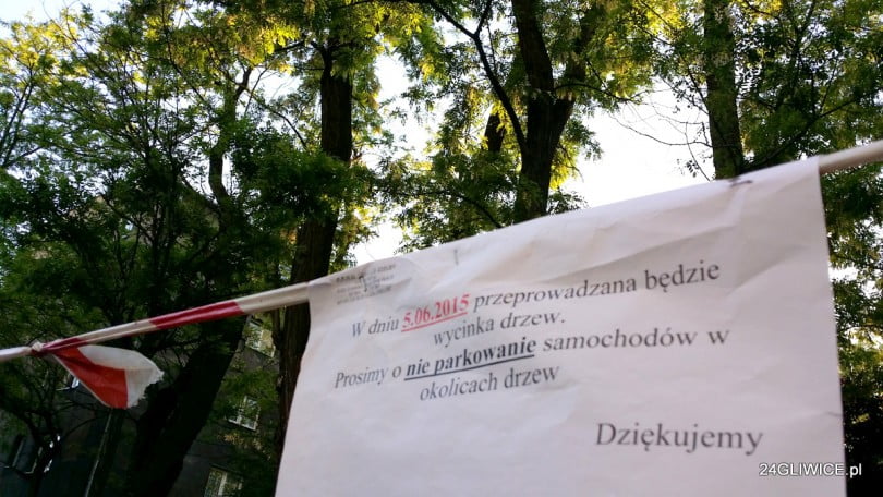 “(…) na ulicy Gruszczyńskiego w Gliwicach, tuż obok redakcji Gazety, pojawiły się informacje o planowanej na najbliższy piątek (05.06.2015) wycince drzew, konkretnie akacji. Jeżeli nawet jest jakiś powód, który uzasadnia tę decyzję, to dlaczego wycinka ma odbyć się w czerwcu, w trakcie kwitnienia tych drzew i wylęgu ptaków? Czy jest to barbarzyństwo bezmyślne, czy rozmyślne?” – pyta w mailu do redakcji Pan Marian.