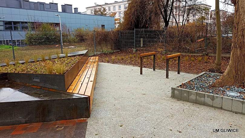 Zamontowano ławki, w tym jedną z oparciem, zintegrowaną z donicami, w których nasadzono ozdobne trawy. Ustawiono też stojaki rowerowe, wybudowano oświetlenie, a wzdłuż chodnika nasadzono byliny, które będą zdobiły teren przez większą część roku