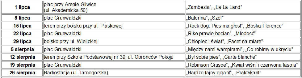 Pierwsze spotkanie kinomanów zaplanowano przy Arenie Gliwice (ul. Akademicka 50). 1 lipca dzieciaki trafią do serca Afryki, a dorośli na wzgórza Hollywood – w programie Letniego Kina Plenerowego jest film animowany „Zambezia” i kasowy hit z Ryanem Goslingiem i Emmą Stone, „La La Land”.