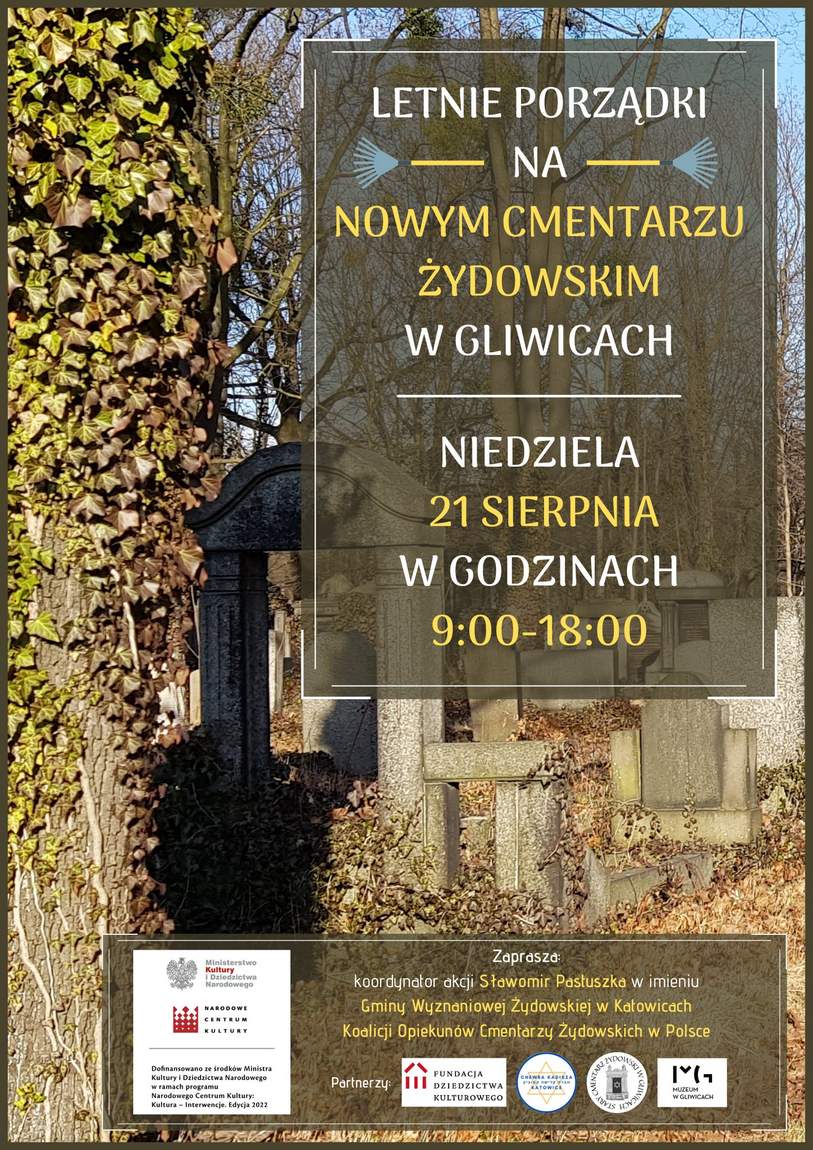 Koalicja opiekunów cmentarzy żydowskich w Polsce i Gminy Wyznaniowej Żydowskiej w Katowicach serdecznie zaprasza w najbliższą niedzielę, 21 sierpnia, do wzięcia udziału w akcji porządkowania cmentarza żydowskiego przy ulicy Poniatowskiego 14 w Gliwicach (wejście przez prawą bramę).
