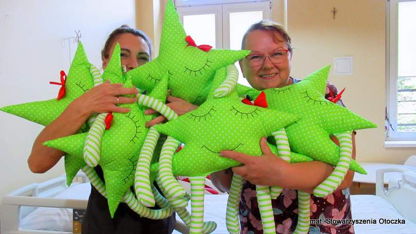 Te przytulanki na pewno umilą pobyt na oddziałach szpitalnych najmłodszym pacjentom. Ponad 50 poduszek jest dziełem akcji społecznego szycia Fundacji Możemy Więcej i wolontariuszek Stowarzyszenia Otoczka.