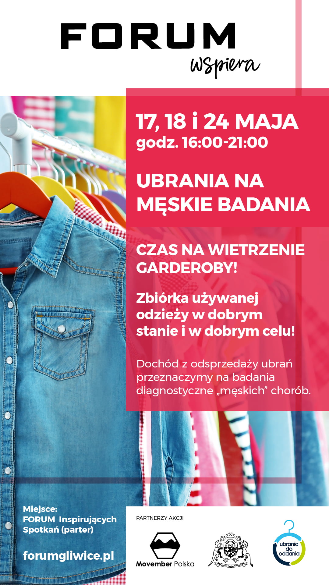 Plan jest prosty, a cel bardzo ważny: 17, 18 i 24 maja chętni przynoszą do Forum (ul. Lipowa 1) nieużywane już ubrania w dobrym stanie. Fundacja Kapitan Światełko – organizator kampanii Movember Polska – zamienia je na środki finansowe.