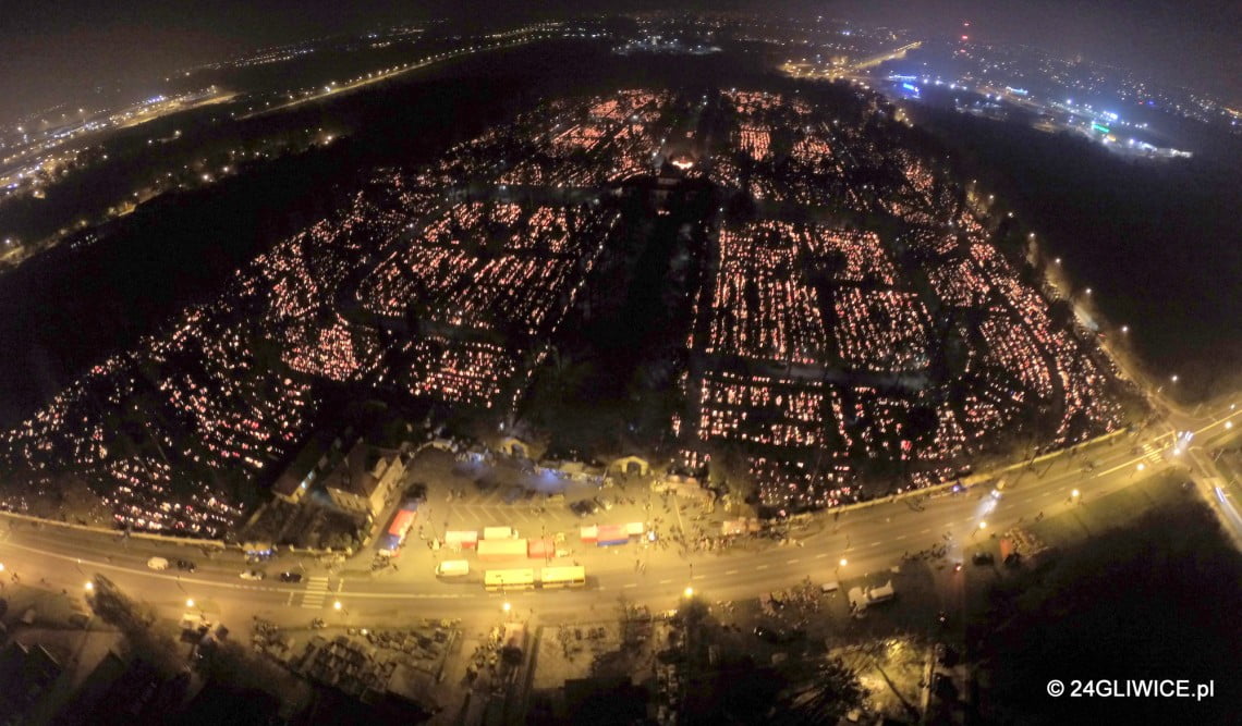 Dzień Wszystkich Świętych. Tysiące płonących zniczy sprawiają, że po zmroku największe cmentarze wyglądają z góry niczym rozświetlone metropolie. Na zdjęciu Cmentarz Centralny w Gliwicach.