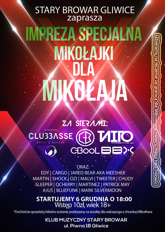 MBrother walczy z ciężką chorobą, a jedyną szansą jest kosztowne leczenie za granicą. Już 6 grudnia w mikołajki w Klubie Stary Browar w Gliwicach (ul. Piwna 1B) odbędzie się specjalna impreza charytatywna MIKOŁAJKI DLA MIKOŁAJA. Start o godzinie 18:00.