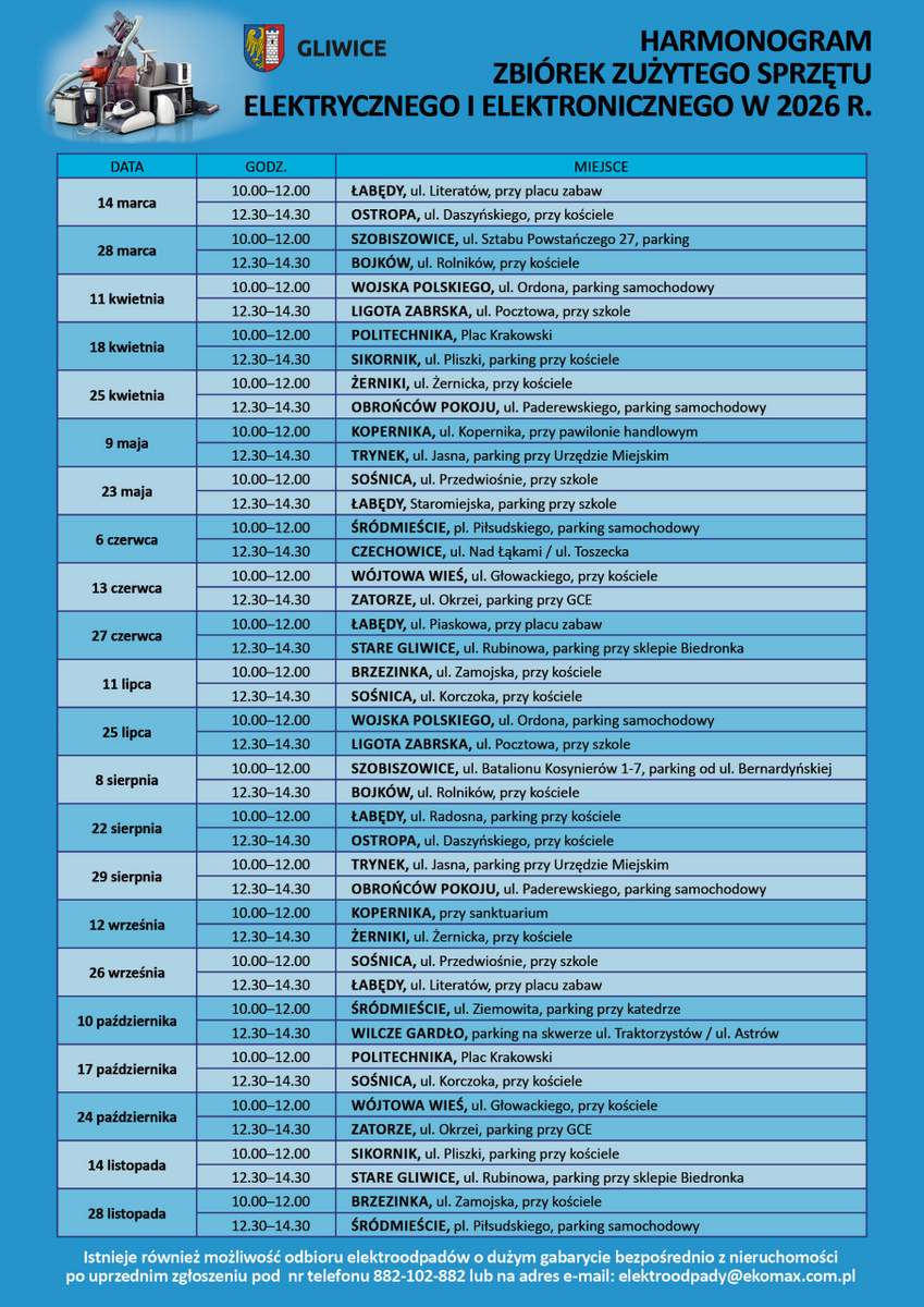 Zbiórki elektrośmieci będą odbywać się w różnych dzielnicach Gliwic od 14 marca do 28 listopada, z częstotliwością co 1-2 tygodnie (w miesiącach parzystych przypadają po 3 terminy). Warto pamiętać, że odpady można dostarczać na miejsce ich odbioru wyłącznie w godzinach stacjonowania tam specjalnego samochodu. Wcześniejsze ich przynoszenie jest niedozwolone i może zostać potraktowane jako zaśmiecanie. Cały harmonogram tegorocznych zbiórek znajduje się na poniższej grafice oraz w formacie PDF: