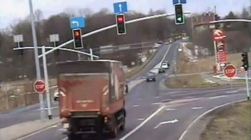 Kierowca rozpędzonej ciężarówki spieszył się tak bardzo, że zignorował czerwone światło na skrzyżowaniu. Zdarzenie zarejestrowały kamery.