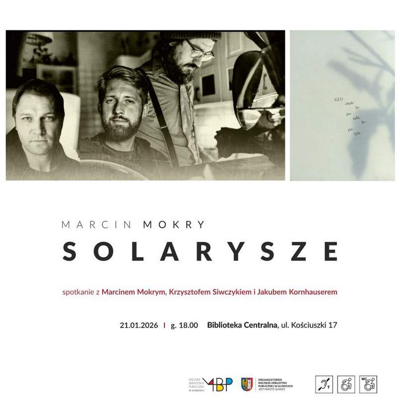 Zapowiada się wieczór z poezją żywą, nieoczywistą i bezpiecznie nieprzewidywalną. W środę, 21 stycznia, w Bibliotece Centralnej odbędzie się spotkanie dotyczące “Solaryszów” – najnowszej książki poetyckiej Marcina Mokrego, w którym wezmą udział Jakub Kornhauser i Krzysztof Siwczyk.