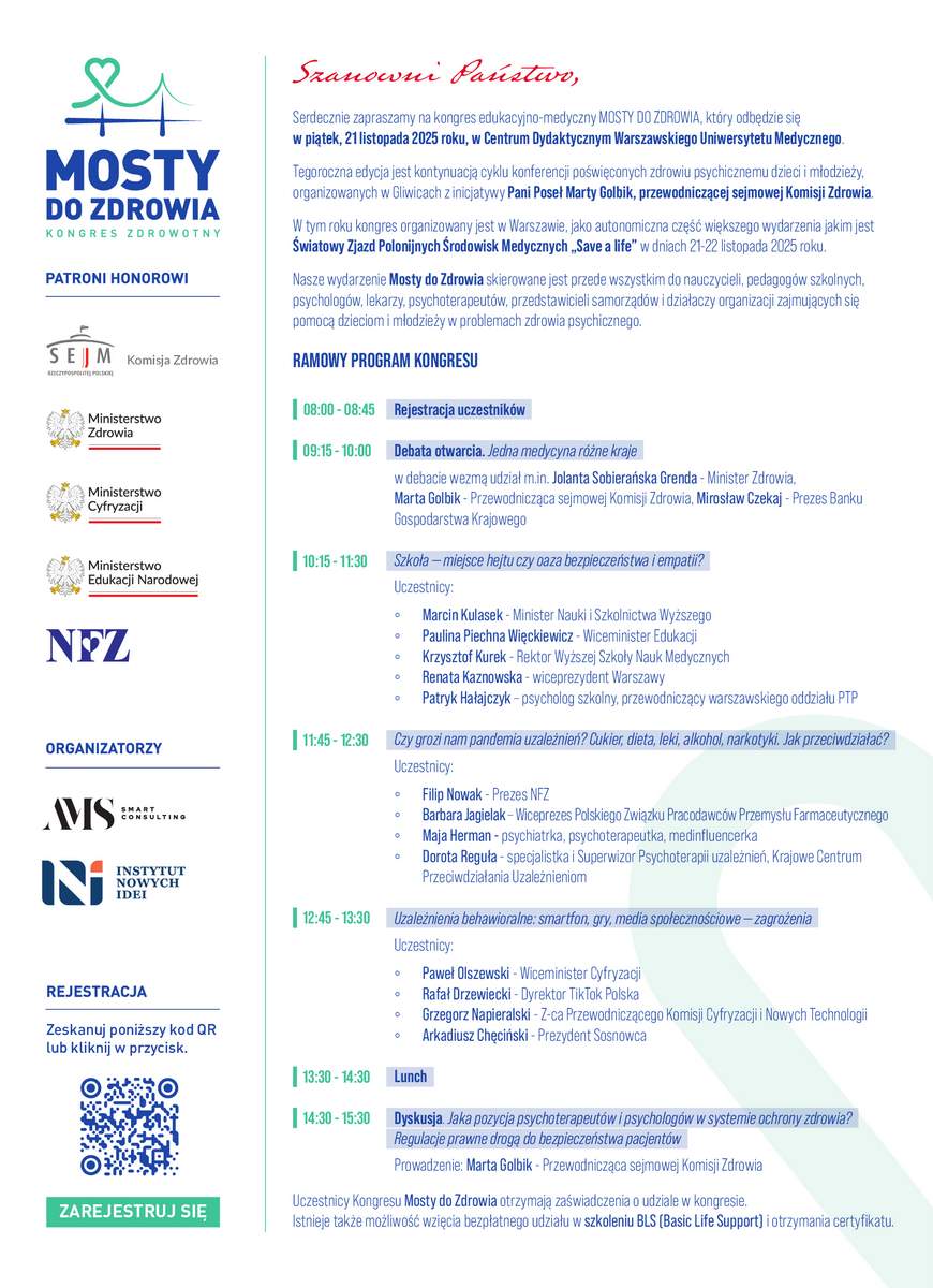 „Mosty do Zdrowia” to wydarzenie, które łączy środowiska i inspiruje do działania. Jak podkreślają organizatorzy, tylko współpraca między nauką, medycyną i edukacją może stworzyć trwałe rozwiązania na rzecz zdrowia psychicznego młodych ludzi.