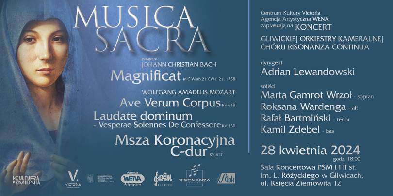 Wysłuchamy także utworów Wolfganga Amadeusza Mozarta, wybitnego kompozytora, który zdaniem wielu krytyków osiągnął muzyczną doskonałość. W jego twórczości znajdziemy emocjonalność, logikę, artystyczny smak i świeżość. Podczas koncertu „Musica Sacra” usłyszymy przykłady dzieł muzyki sakralnej Mozarta. Na finał zabrzmi Msza Koronacyjna – poważna, odświętna w charakterze. Utwór uznawany jest za jeden z najwspanialszych w twórczości wielkiego wiedeńskiego kompozytora. Powstał na użytek katedry w Salzburgu, przypuszczalnie z okazji świąt Wielkiej Nocy, a nie – jak wcześniej sądzono − z okazji koronacji cudownego obrazu Matki Boskiej w Maria-Plain.