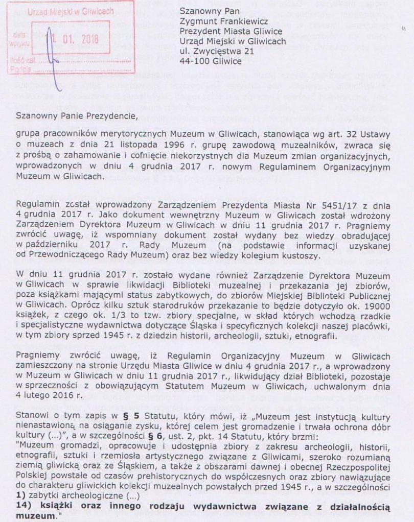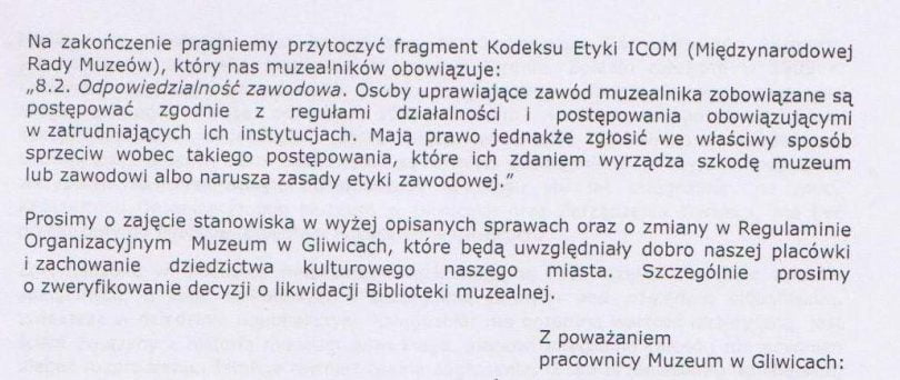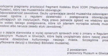 – Pragniemy przytoczyć fragment kodeksu etyki Międzynarodowej Rady Muzeum zgodnie, z którym osoby uprawiające zawód muzealnika […] mają prawo zgłosić we właściwy sposób sprzeciw wobec takiego postępowania, które ich zdaniem wyrządza szkodę muzeum lub zawodowi albo narusza zasady etyki zawodowej – kończą swój apel do prezydenta Frankiewicza gliwiccy muzealnicy.