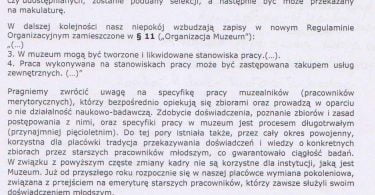 [perfectpullquote align=”full” bordertop=”false” cite=”” link=”” color=”” class=”” size=””]Pismo podpisane przez dziesięć osób, w tym część kierowników poszczególnych działów placówki, to reperkusja zmian, jakie w ostatnich miesiącach zaszły w Muzeum.[/perfectpullquote] Zdaniem pracowników, reorganizacja to “zaplanowana akcja odwetowa”, za pismo, które na początku października wystosowali do dyrekcji.