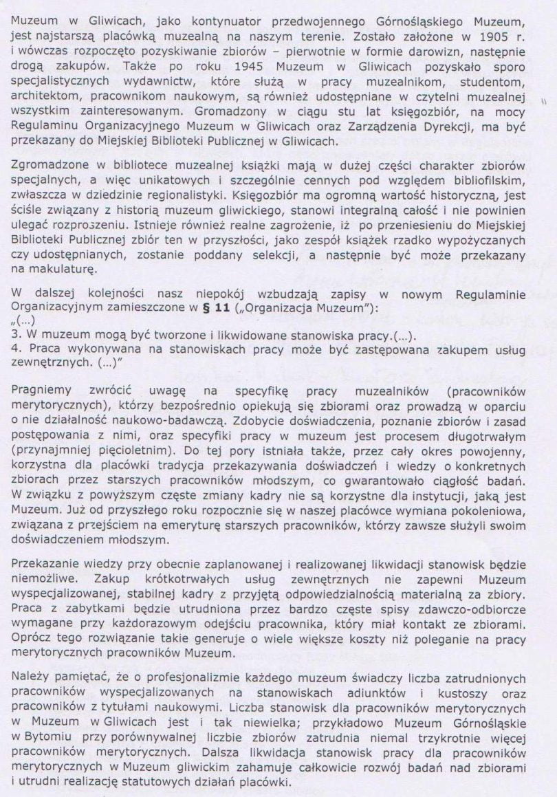 – Dalsza likwidacja stanowisk pracy dla pracowników Muzeum zahamuje całkowicie rozwój badań nad zbiorami i utrudni realizację statutowych działań placówki – piszą w piśmie, które zostało także skierowane do wiadomości gliwickich radnych i prezesa Oddziału Śląskiego Stowarzyszenia Muzealników Polskich.