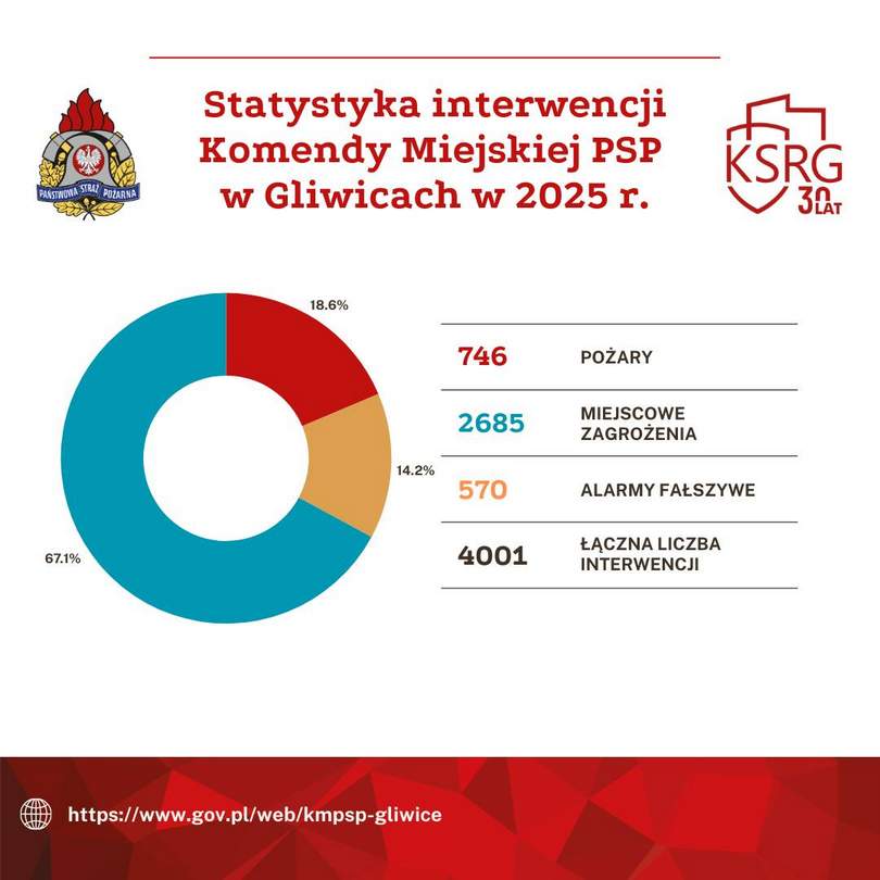 Rok 2025 był dla strażaków Komendy Miejskiej Państwowej Straży Pożarnej w Gliwicach oraz jednostek OSP z terenu miasta i powiatu gliwickiego czasem intensywnej służby – podjęto łącznie 4001 interwencji. Oprócz przypadków wystąpienia ognia, były to najczęściej miejscowe zagrożenia (2685 wyjazdów), a 570 razy przyjęto fałszywe zgłoszenia.