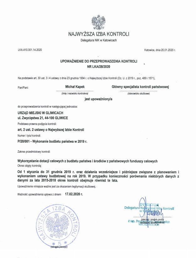 Główny specjalista kontroli państwowej, Michał Kapek, upoważnienie do wykonywania czynności sprawdzających otrzymał w poniedziałek, 20 stycznia. Kontrola katowickiej delegatury Najwyższej Izby Kontroli potrwa prawdopodobnie do 17 lutego – do tego dnia obowiązuje wydany dokument (z opcją przedłużenia).