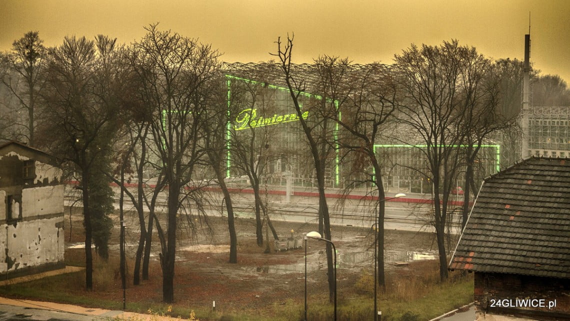 Widok na gliwicką Palmiarnię z wiaduktu na ul. Bohaterów Getta Warszawskiego. Interesujący neon będzie niestety słabo widoczny z perspektywy kierowców poruszających się Drogową Trasą Średnicową. Na wysokości obiektu samochody będą wpadać w tunel pod centrum miasta.