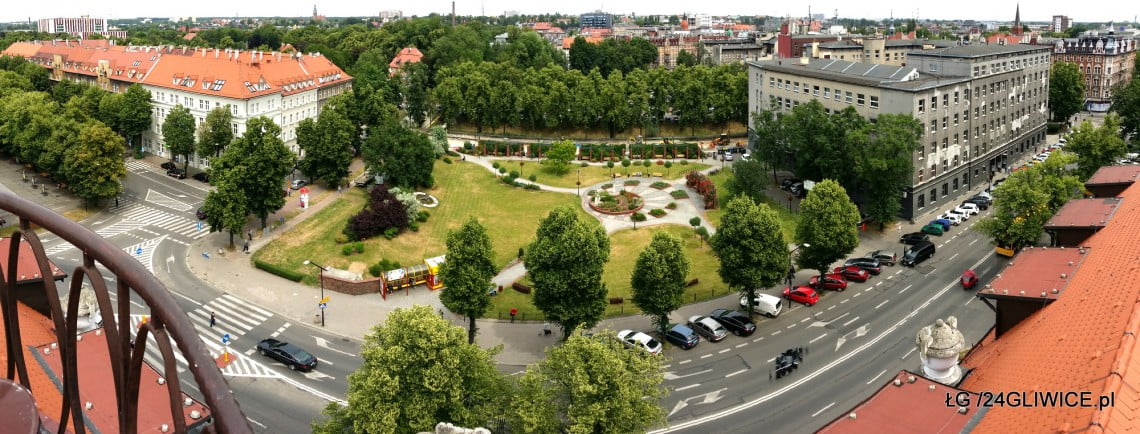 Tutaj z aparatem rzadko kiedy ktoś zagląda, nam udało się dostać na wieżyczkę budynku Sądu Administracyjnego przy ul. Wyszyńskiego. Stąd widać, że z zielenią w centrum Gliwic nie jest jeszcze tak źle. Fot. Łukasz Gawin