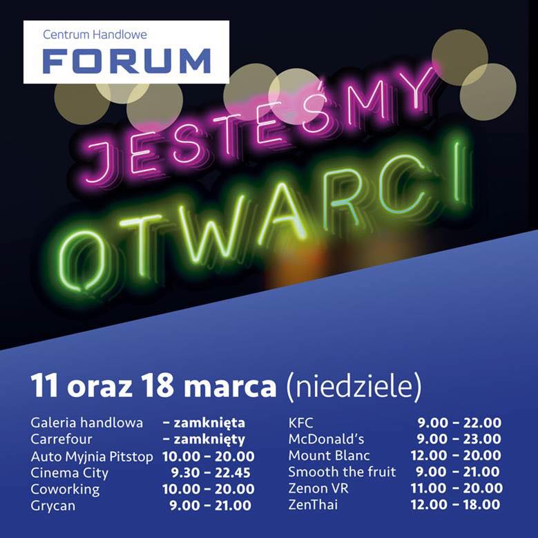W centrum handlowym Forum bez względu na nowe przepisy, czynne będzie kino Cinema City. To samo dotyczy salonu rzeczywistości wirtualnej ZENonVR, a także strefy wspólnej pracy, zwanej coworkingiem. W niedziele wolne od handlu otworzą się także niektóre kawiarnie i restauracje, w tym m.in. KFC, McDonald’s i Mount Blanc.