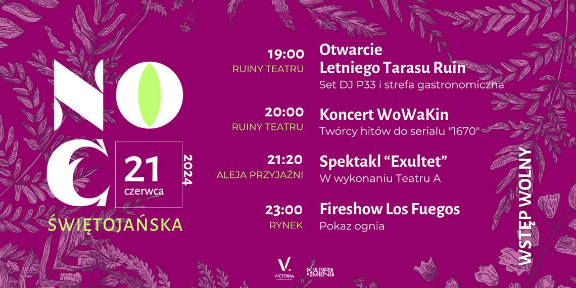Już w piątek czeka nas wyjątkowa NOC ŚWIĘTOJAŃSKA – pełna ognia, muzyki, wiru tańca i zabawy. W Ruinach Teatru Victoria zaplanowano koncert zespołu WoWaKin. Aleja Przyjaźni wypełni się dźwiękami, które zaserwuje nam DJ P33. Stanie się także sceną dla aktorów Teatru A, którzy specjalnie na tę noc przygotują spektakl.