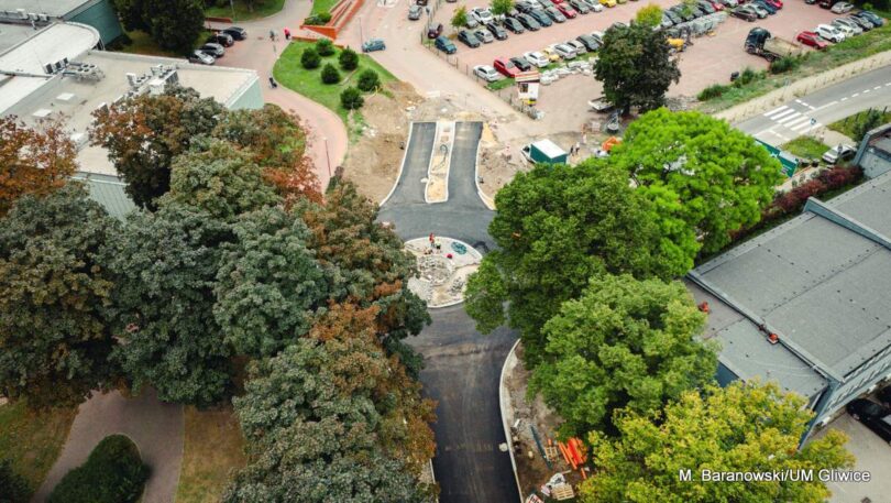 Na placu budowy w ciągu ulicy Sienkiewicza widać spore zaawansowanie prac. Powstaje rondo, które usprawni ruch na wjeździe do Narodowego Instytutu Onkologii. Obiekt zyskał już warstwę nawierzchni.