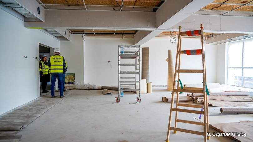 Obecnie intensywne prace wykończeniowe toczą się w jego środku, a wokół powstają chodniki, parking i przyszłe place zabaw.