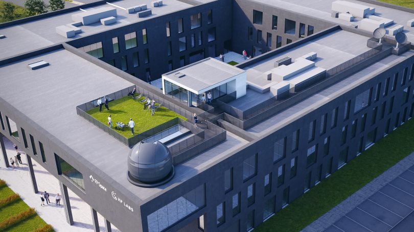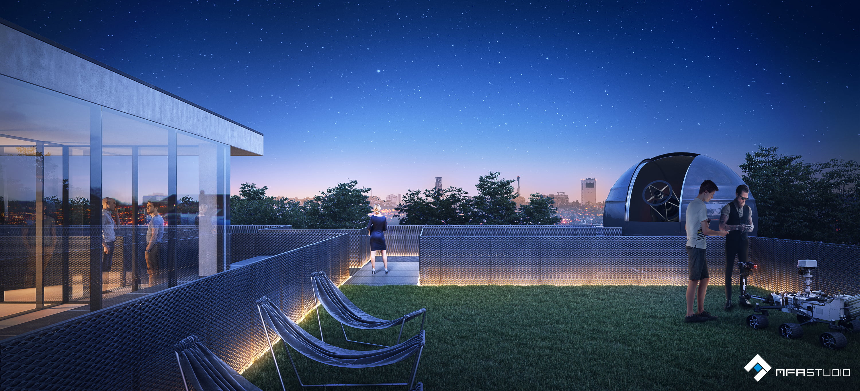[perfectpullquote align=”full” bordertop=”false” cite=”” link=”” color=”” class=”” size=””]Na dachu budynku powstanie obserwatorium astronomiczne z kopułą o średnicy 5,5 m oraz zielony taras widokowy o powierzchni 100 m2.[/perfectpullquote]Obserwatorium posłuży do obserwacji nieba oraz nawiązywania dwustronnej łączności laserowej z satelitą budowanym przez specjalistów z KP LABS w ramach projektu Intuition-1.