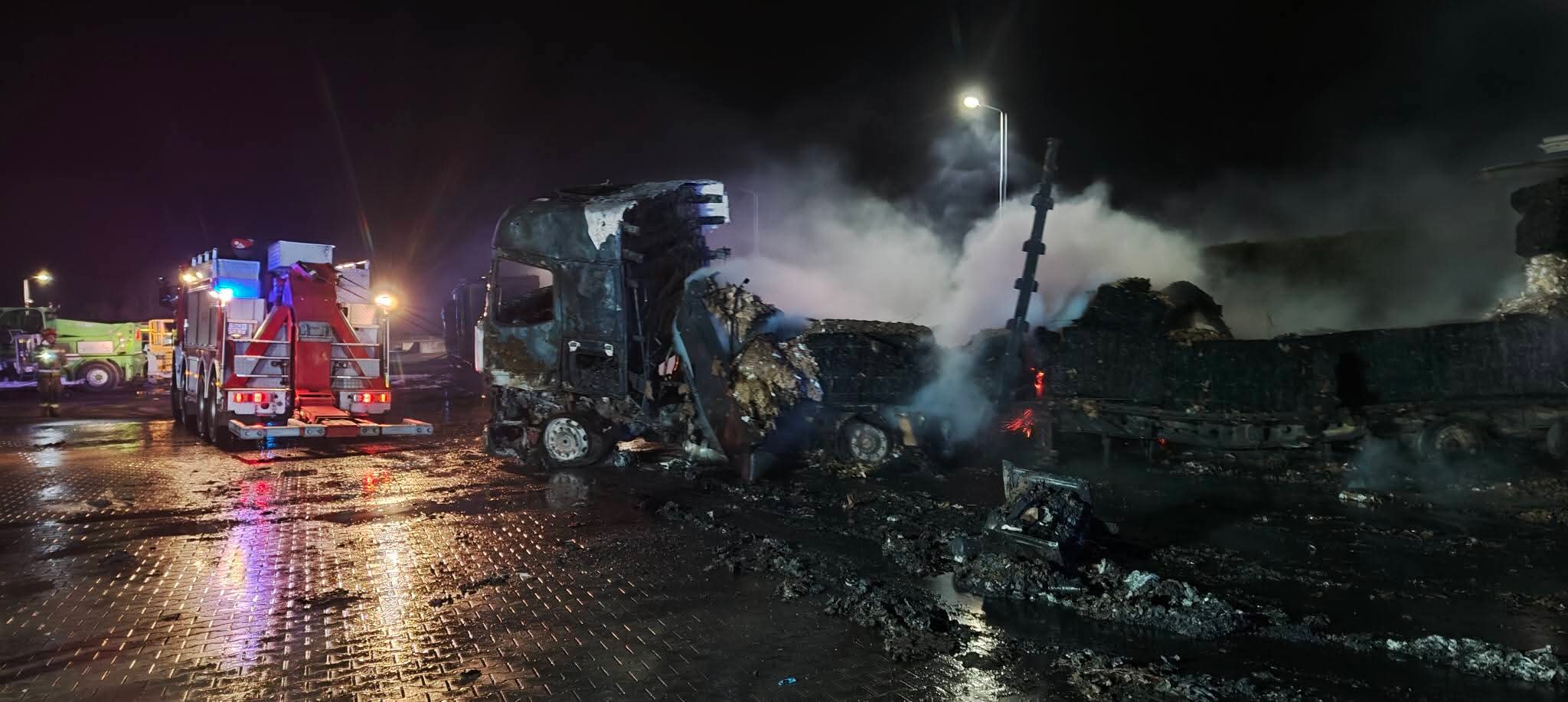 Na skutek zdarzenia spłonęło 6 zestawów ciężarowych (ciągnik siodłowy wraz z naczepą), a kolejny zestaw, a także samochód dostawczy, uległy nadpaleniu.