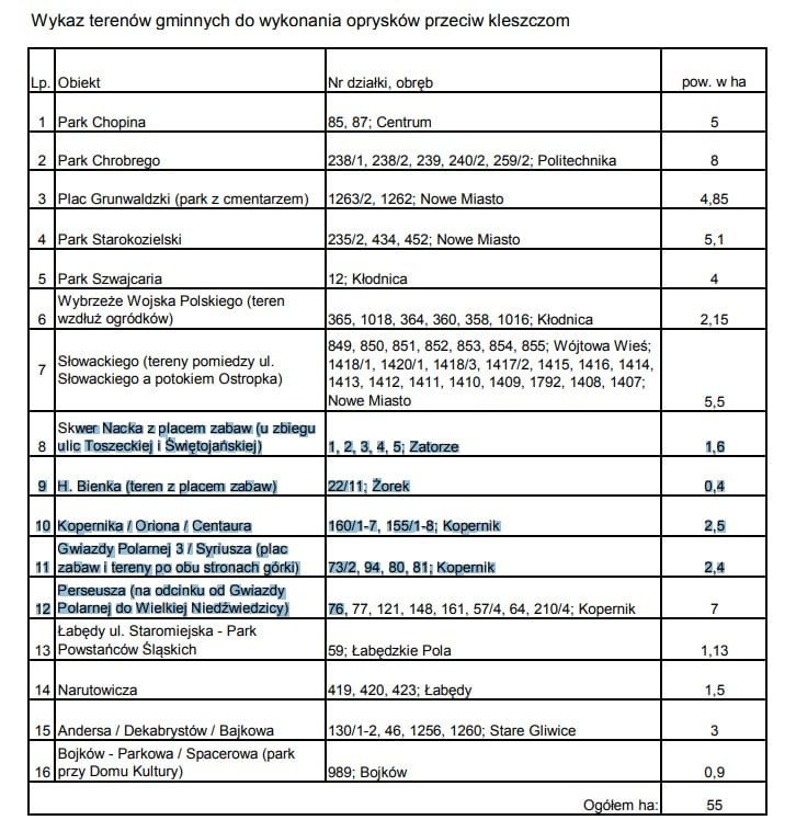 Na terenie Gliwic wkrótce rozpoczną się opryski przeciwko kleszczom. Zabiegi obejmują tereny o łącznej powierzchni 55 hektarów, przede wszystkim miejsca w pobliżu parków i zieleńców. Dezynsekcja prowadzona jest na zlecenie Miejskiego Zarządu Usług Komunalnych.