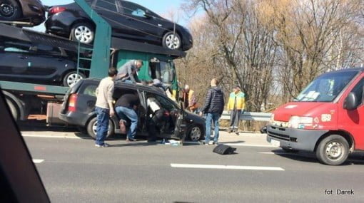 Po godzinie 14.00 samochód osobowy zderzył się z lawetą przewożącą auta.