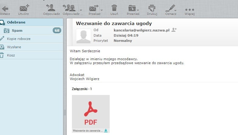 Atak ma charakter masowy, jeden z takich podejrzanych maili trafił również do redakcji 24gliwice. Nadawca wiadomości próbując wprowadzić w błąd odbiorców podszywa się pod adwokata, a sama wiadomość wygląda tak jak na screenie.