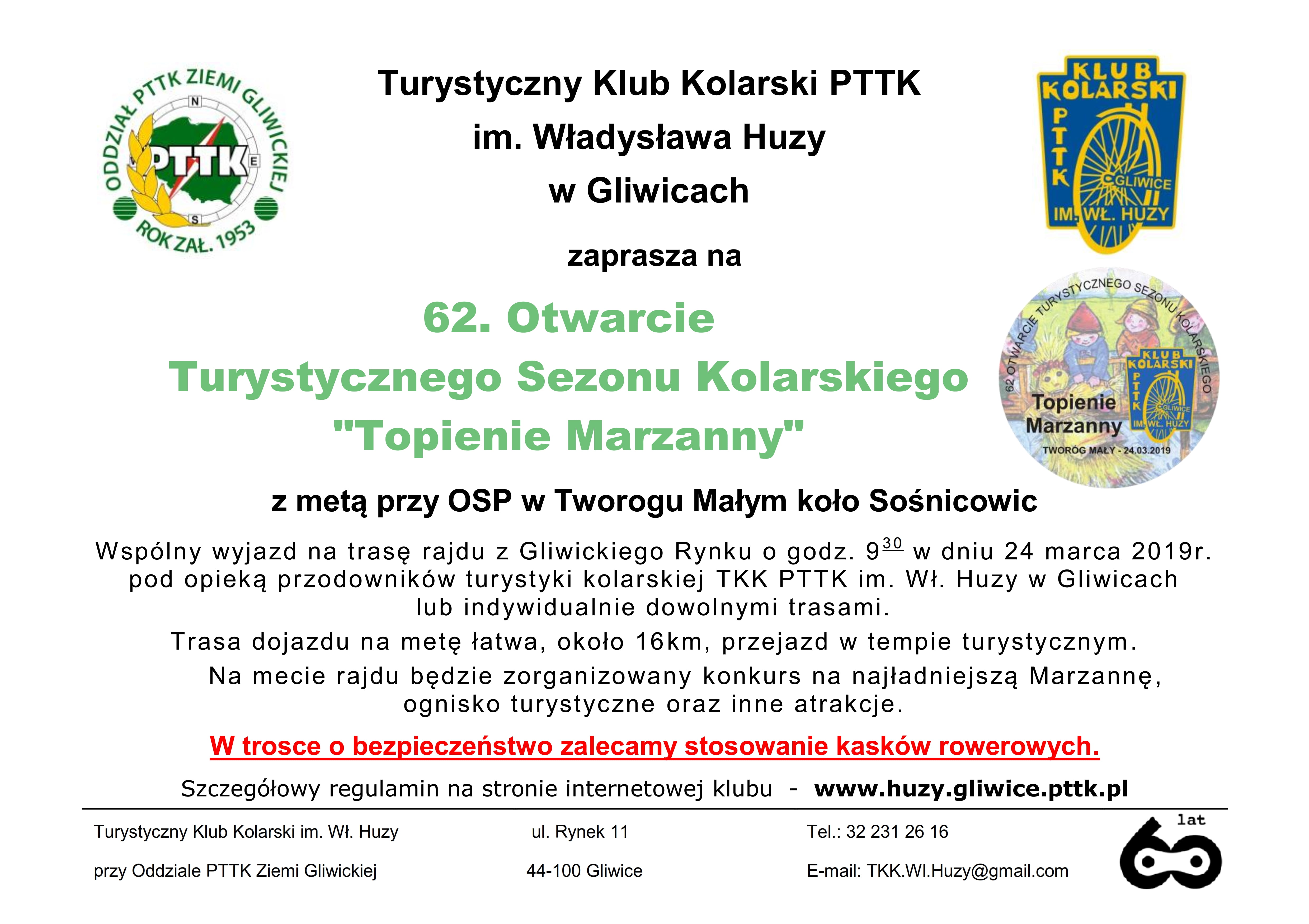 Kolarze z Turystycznego Klubu Kolarskiego im. W. Huzy otworzą w niedzielę (24 marca) 62 Turystyczny Sezon Kolarski. Zbiórka uczestników rajdu „Topienie marzanny” zaplanowana jest na godzinę 9:30 na gliwickim Rynku.