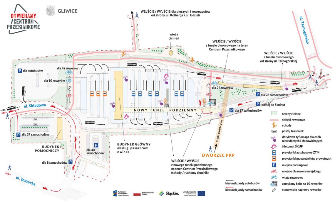 Wybierając pierwsze, trafimy na początek strefy zadaszeń, a dokładniej rzecz ujmując na wyspę za trawiastym skwerem od strony ul. Tarnogórskiej. To miejsce przygotowane na potrzeby rowerzystów – znajdziemy tam zamykany boks na 10 rowerów, wiatę na 24 rowery oraz stanowisko naprawy rowerów. Drugim wyjściem, połączonym z ruchomym chodnikiem (trawelatorem), przedostaniemy się już na teren kilkunastu peronów autobusowych CP. Tam znajdziemy biletomat ŚKUP i następną tyflomapę. Trzecie wyjście z nowego tunelu podziemnego będzie prowadziło bezpośrednio do głównego budynku obsługi pasażerskiej, w którym ma działać punkt obsługi podróżnych korzystających z autobusów miejskich, regionalnych i międzynarodowych. Osoby z niepełnosprawnościami wjadą z podziemia do budynku głównego (a z niego dostaną się na teren CP) przeszkloną windą. W okolicy budynku znajdą się 2 kolejne tyflomapy i biletomat ŚKUP.
