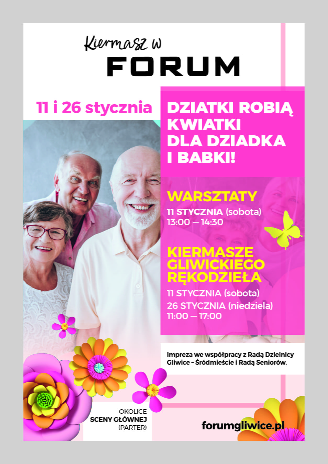 Kiermasze oraz warsztaty będą teraz odbywać się w okolicach sceny głównej (parter). Wstęp i udział jest bezpłatny. Planowane daty kiermaszów w I kwartale 2020 roku: 11 i 26 stycznia, 8 lutego, 14 i 29 marca. Wydarzenie wspierają i współorganizują gliwicka Rada Dzielnicy Śródmieście i Rada Seniorów.