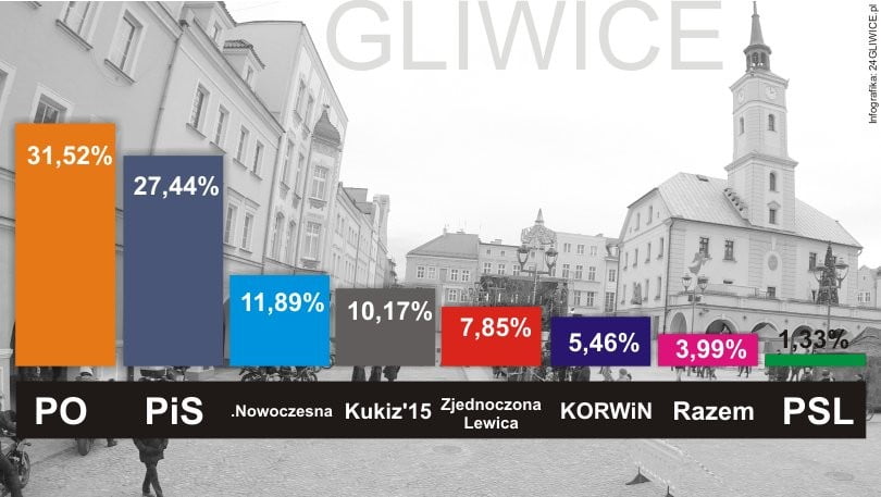 W Gliwicach PO zdobyła 31,5% głosów i dość pewnie wyprzedziła PiS (27,5%). Dużo lepszy wynik niż w skali kraju osiągnęła Nowoczesna (prawie 12%). Gliwiczanie na Wiejską wysłaliby też przedstawicieli Kukiz’15 i partii KORWiN.