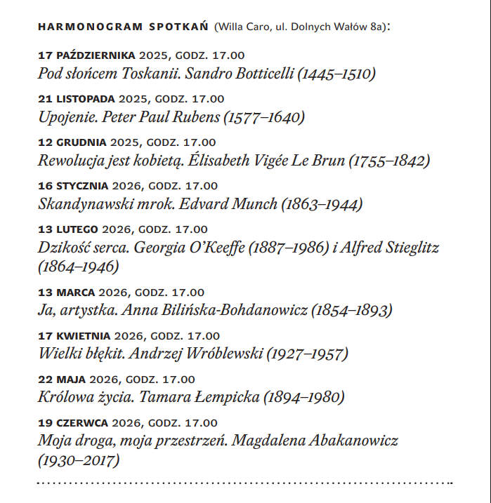 Wykłady odbywają się raz w miesiącu w Willi Caro (ul. Dolnych Wałów 8a). Spotkania tworzy i prowadzi Marta Witoń-Jankowska, historyczka sztuki, autorka m.in. cykli wykładów przygotowanych dla Muzeum w Gliwicach: „Sztuka patrzenia. Panorama dziejów sztuki”, „Poza ramy. Artyści bez cenzury” oraz wielu lekcji muzealnych dla dzieci i młodzieży, w tym popularnej serii „Ekstra-Klasa…” przybliżającej sztukę młodszym odbiorcom.