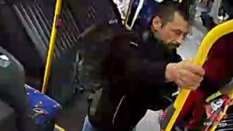 Mężczyzna, którego zdjęcie z monitoringu prezentuje policja, jest podejrzany o pobicie innego pasażera w autobusie. Można pomóc śledczym zgłaszając swoje podejrzenia co do tożsamości podejrzanego.