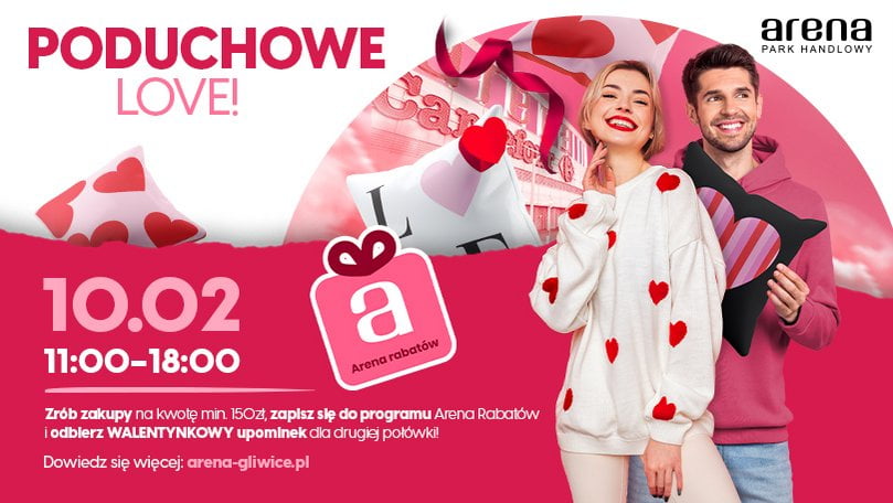 Wystarczy w sobotę 10 lutego, w godz. 11.00 – 18.00 odwiedzić Arenę i wydać 150 PLN oraz zapisać się do programu lojalnościowego ARENA Rabatów, aby otrzymać walentynkową poduchę z miłosnym nadrukiem!