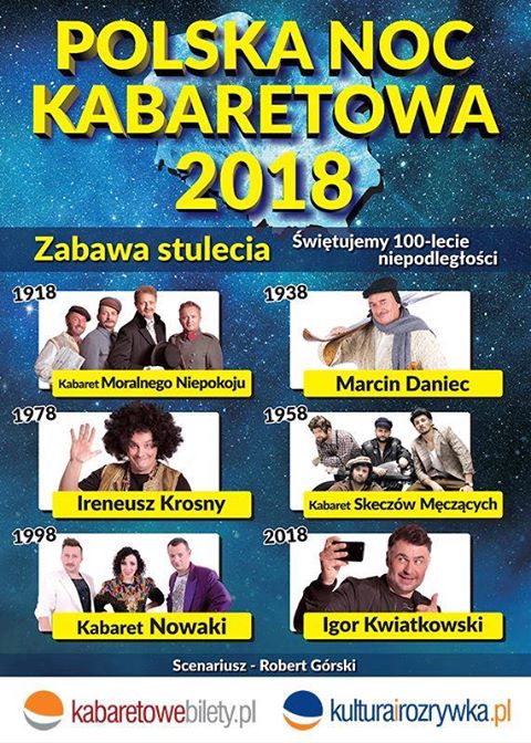 [perfectpullquote align=”full” bordertop=”false” cite=”” link=”” color=”” class=”” size=””]W show wystąpią również: Ireneusz Krosny, Marcin Daniec, Kabaret Nowaki, Kabaret Skeczów Męczących oraz niezrównany Igor Kwiatkowski.[/perfectpullquote]– Fenomen Polskiej Nocy Kabaretowej polega na tym, że zawsze wspólnie z kolegami gramy przy pełnej frekwencji, a gramy w największych salach koncertowych w Polsce jak katowicki Spodek czy poznańska Arena. W tym roku obchodzimy stulecie odzyskania niepodległości, więc temat nasuwał się sam. Przygotowaliśmy oprawę, która do niego nawiązuje – mówią członkowie Kabaretu Moralnego Niepokoju.