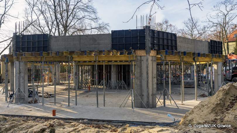 Obecnie gotowe są już żelbetowe elementy konstrukcyjne, wymurowane ściany wewnętrzne, strop antresoli. Kolejnym etapem będzie konstrukcja dachu oraz przeszklenia głównej sali konsumpcyjnej.