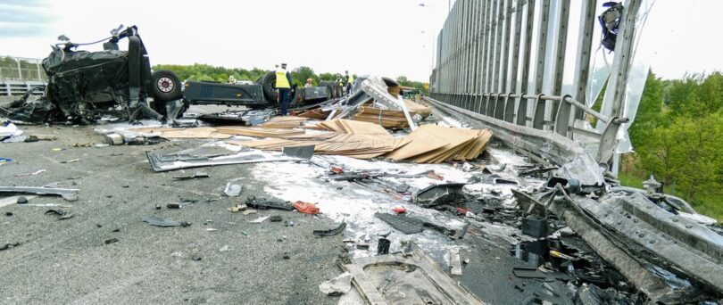 W wyniku wypadku doszło do poważnych uszkodzeń infrastruktury drogowej, w tym ekranów akustycznych, barier mostowych oraz nawierzchni jezdni w kierunku Katowic.