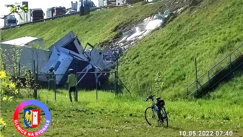 Dramatycznie wyglądający wypadek na autostradzie A4. Ciężarówka wypadła z jezdni i spadła z nasypu, po którym biegnie droga. W zdarzeniu brał udział samochód osobowy i wspomniany TIR. Na szczęście nikt nie zginął.