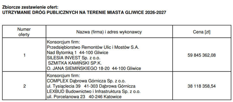 Wraz z końcem marca upłynął termin składania ofert do przetargu na utrzymanie dróg publicznych na terenie Gliwic w latach 2026-2027. Wpłynęły dwie oferty, a różnica między nimi to prawie 22 mln zł.