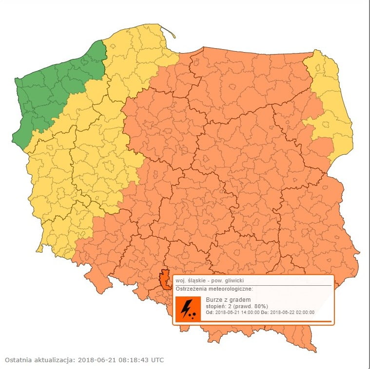 Według danych Instytutu Meteorologii i Gospodarki Wodnej, Gliwice znajdują się w pasie oznaczonym na pomarańczowo, co oznacza duże (80%) prawdopodobieństwo pojawienia się gwałtownych zjawisk atmosferycznych. Stopień zagrożenia określono jako 2.