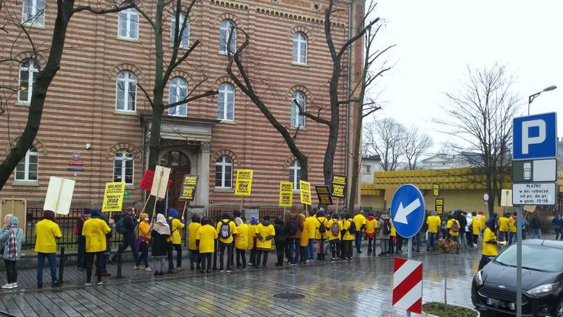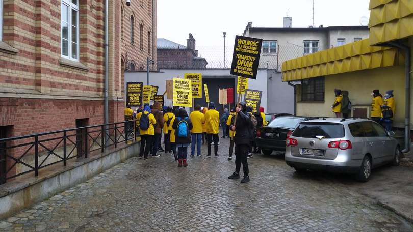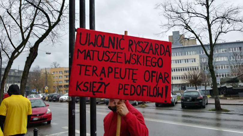 Przed Sądem Rejonowym oraz Aresztem Śledczym we wtorek przed południem odbył się protest kilkudziesięciu osób ubranych w żółte koszulki, trzymających transparenty z hasłem “Wolność dla Ryszarda Matuszewskiego, terapeuty ofiar pedofilów w sutannach”.