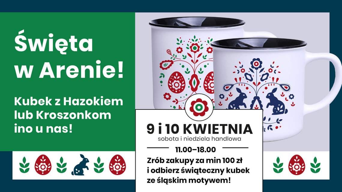 Hazok czyli wielkanocny zajączek to jeden z najbardziej śląskich zwyczajów wpisanych w święta. Zatem niech tradycji stanie się zadość! Każdy kto w sobotę lub niedzielę (9 i 10 kwietnia) w godz. 11.00 – 18.00 zrobi w Arenie zakupy za minimum 100 złotych – otrzyma hazoka, czyli świąteczny kubek z motywem właśnie śląskiego zajączka lub wzoru naszej pisanki zwanej kroszonkom. Mamy nadzieję, że świąteczna kawa z tradycyjnym motywem będzie smakowała wybornie!