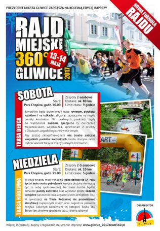 Aby wziąć udział w tym wydarzeniu, należy zapisać swoją drużynę na stronie internetowej www.gliwice_2017.team360.pl. Więcej informacji oraz regulamin zawodów można znaleźć pod adresem www.team360.pl. Organizatorem Rajdu Miejskiego 360 stopni jest Miasto Gliwice.